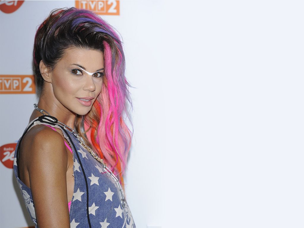 Description: A woman with pink hair and a star print top on posing for a picture in front of a white wall.