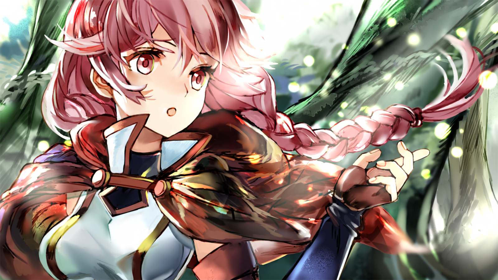 Description: A woman with pink hair and a long pink hair is holding a sword in her hand and a green background.