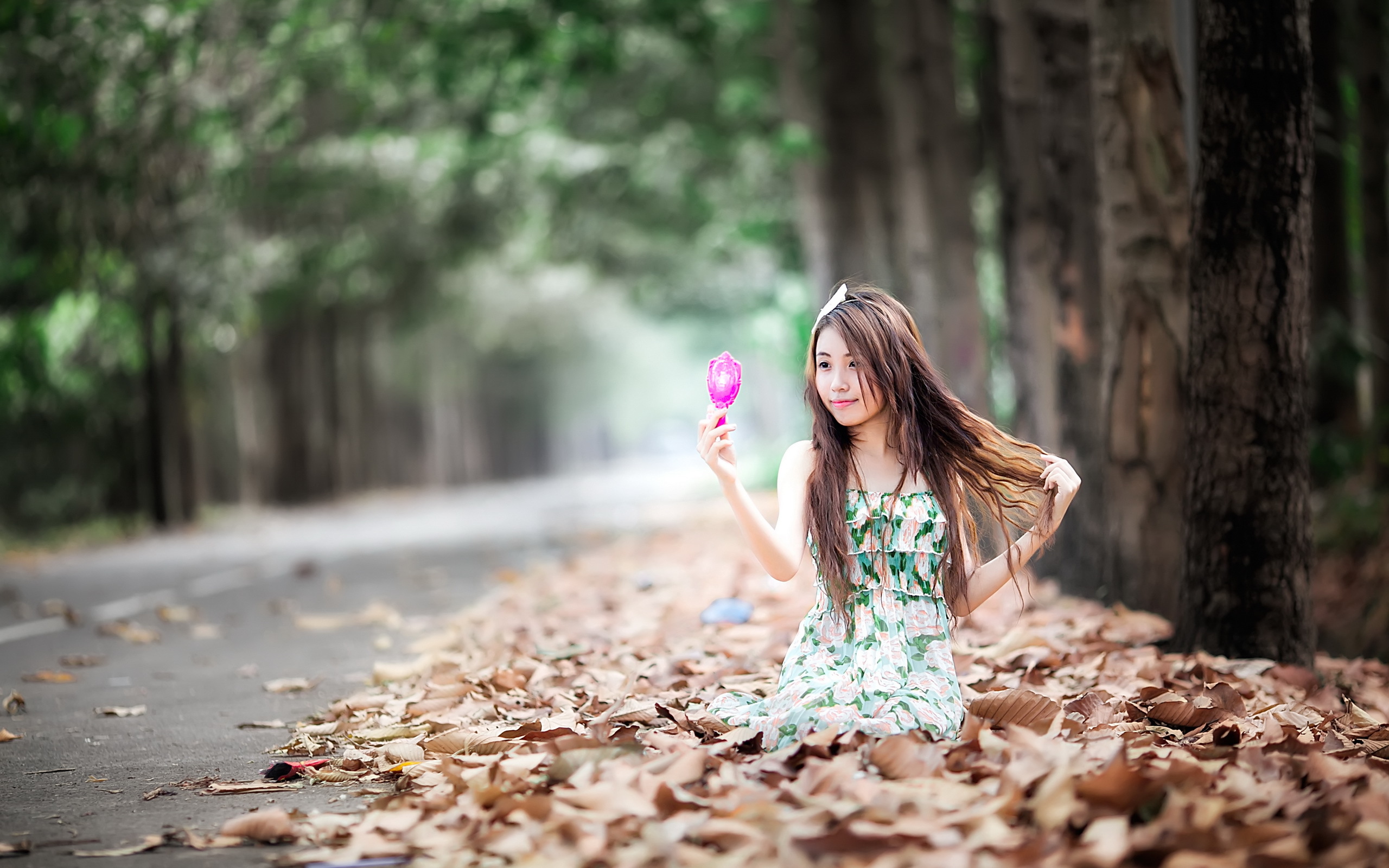Description: A woman sitting on the ground holding a pink object in her hand and a tree in the background with leaves on the ground.