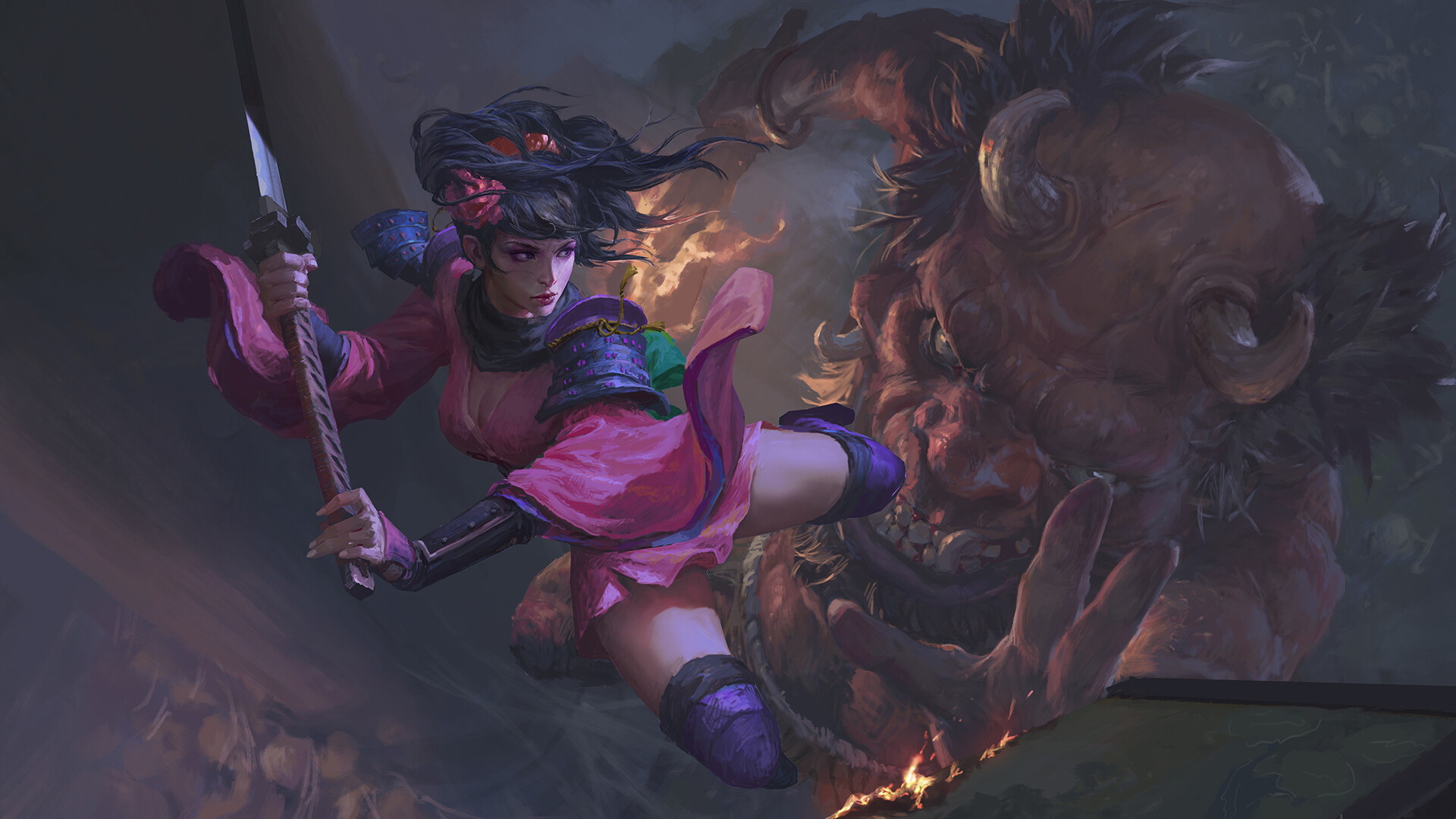 Description: A woman in a pink outfit holding a sword in front of a demon with a demon head on it.
