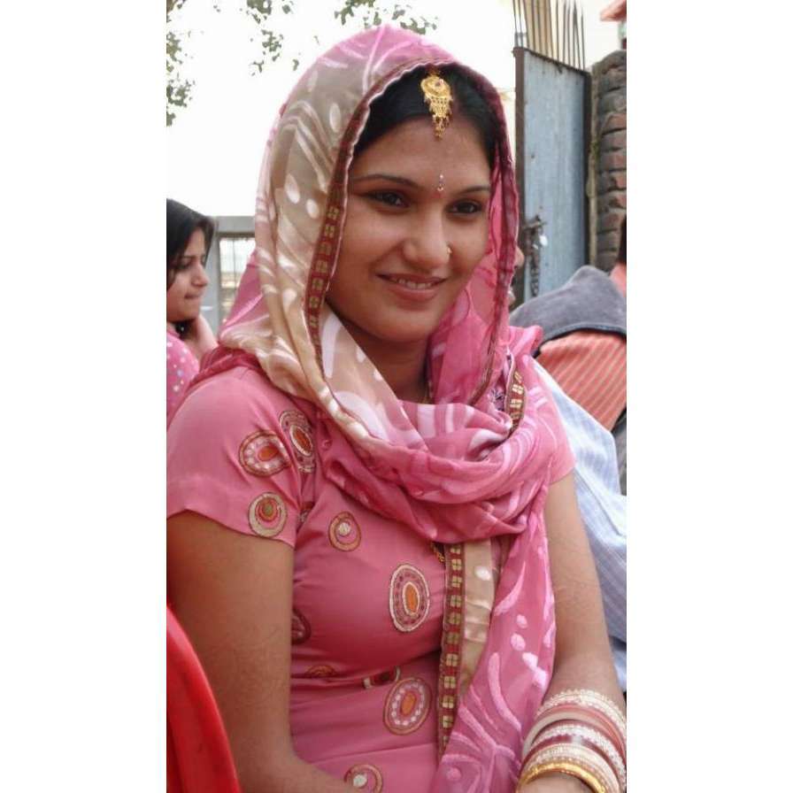 Description: A woman in a pink sari and head scarf smiles for the camera while sitting down with a smile on her face.