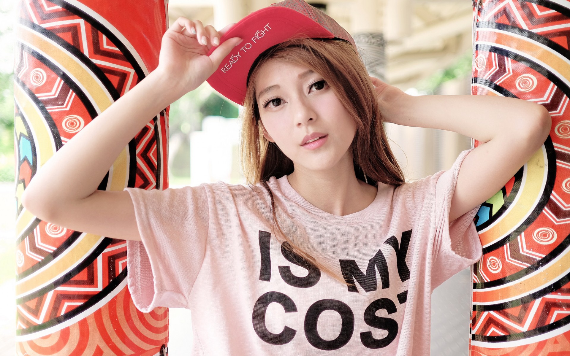 Description: A woman wearing a pink shirt and a red hat with her hands on her head and her hair in the air.