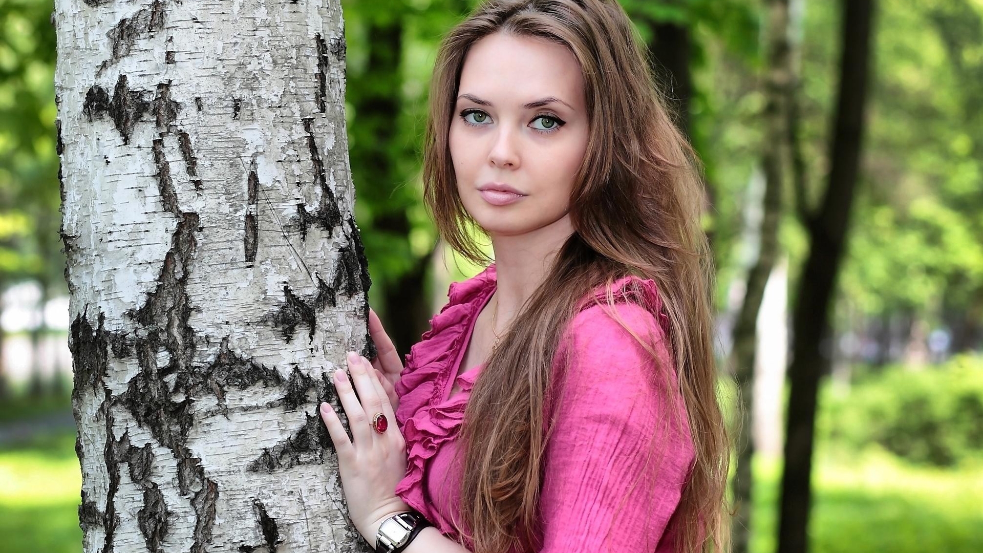 Description: A woman in a pink shirt is leaning against a tree trunk and posing for a picture in a park.