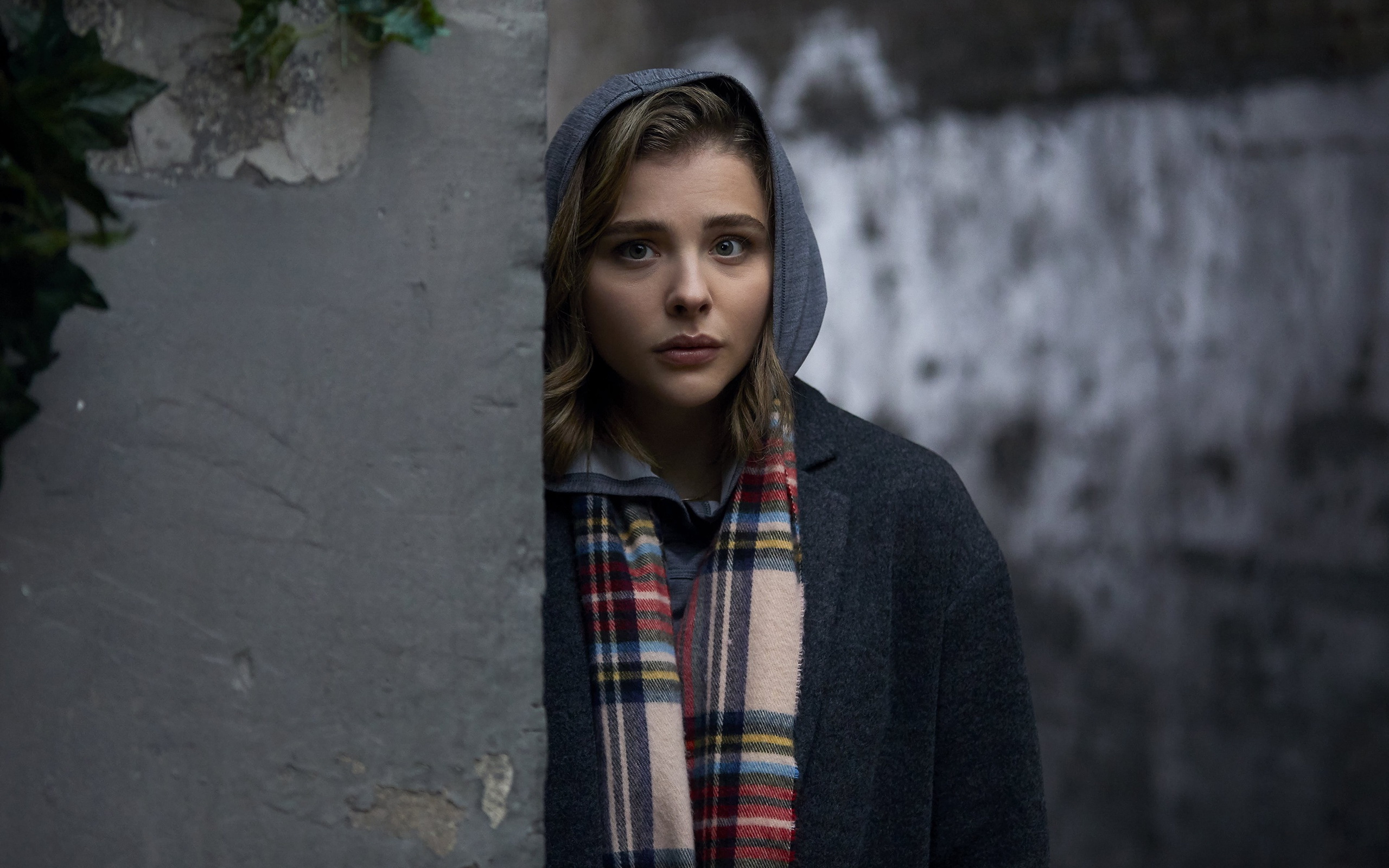 Description: A woman wearing a plaid scarf and a hoodie looks into the camera while standing in front of a wall.