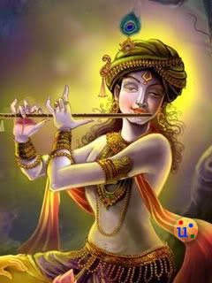 Description: A painting of a woman playing a flute with a peacock on her head and a peacock on her shoulder.