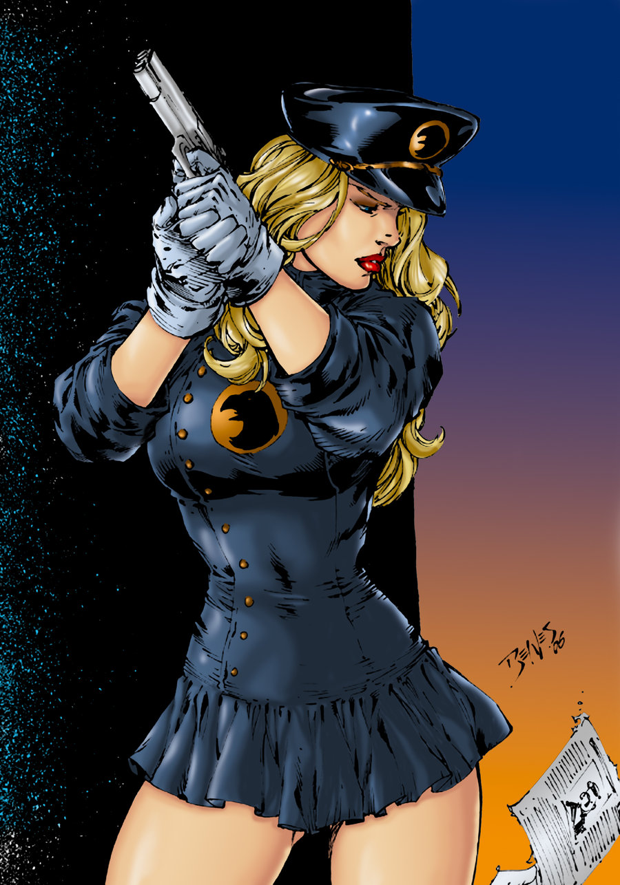Description: A woman in a police uniform holding a gun and a newspaper in her hand and a gun in her other hand.