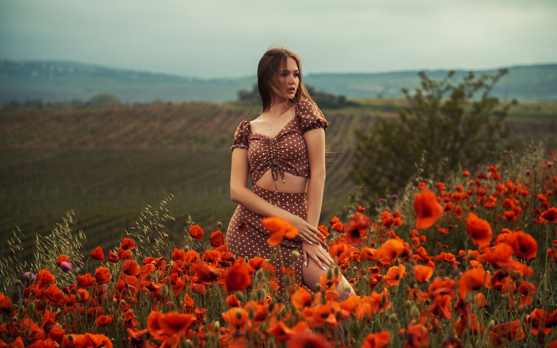 Description: A woman in a polka dot bikini standing in a field of flowers with a hill in the background and a sky in the background.