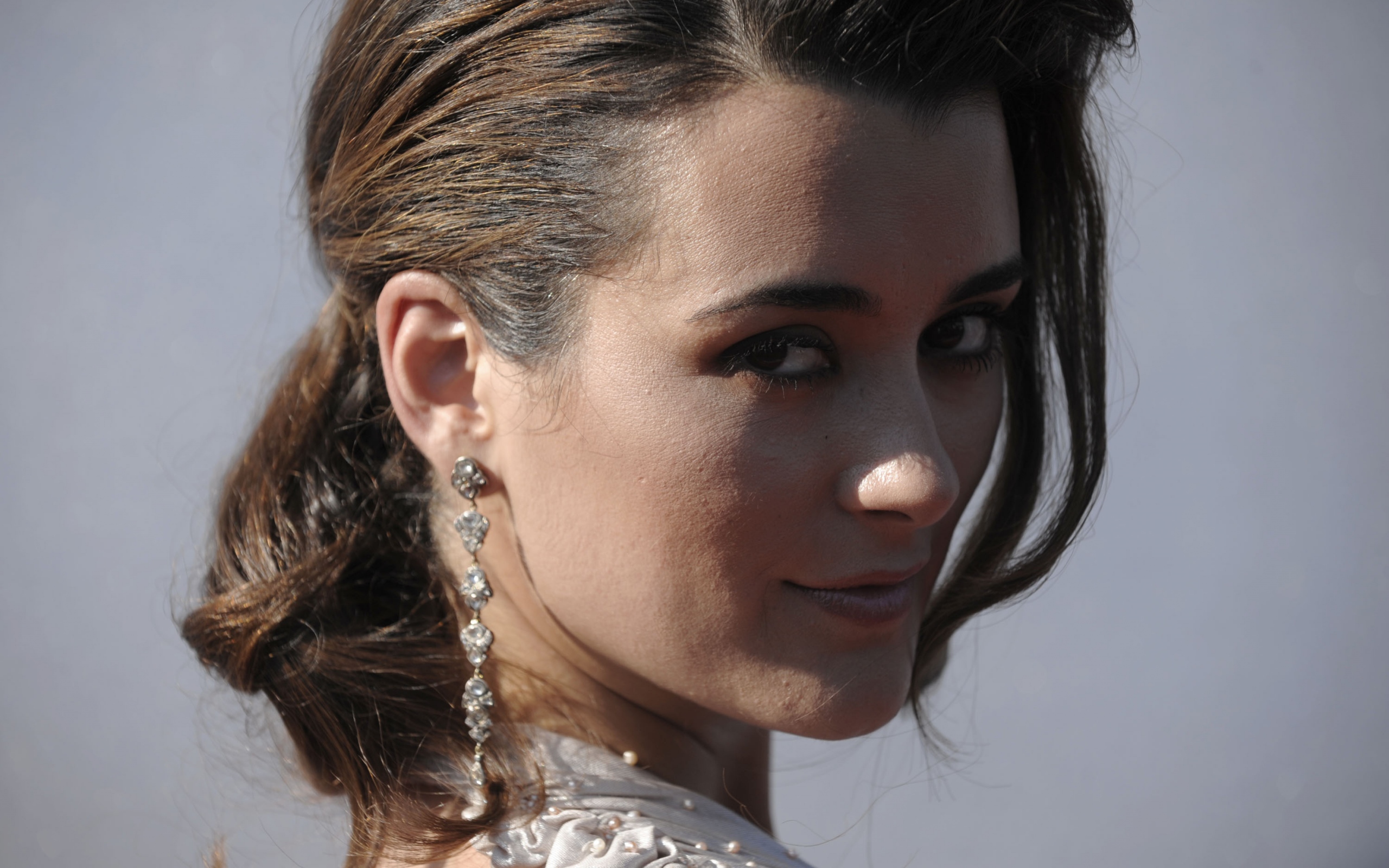 Description: A woman with a ponytail and earrings on her head looking off to the side with a white background and a light gray sky.
