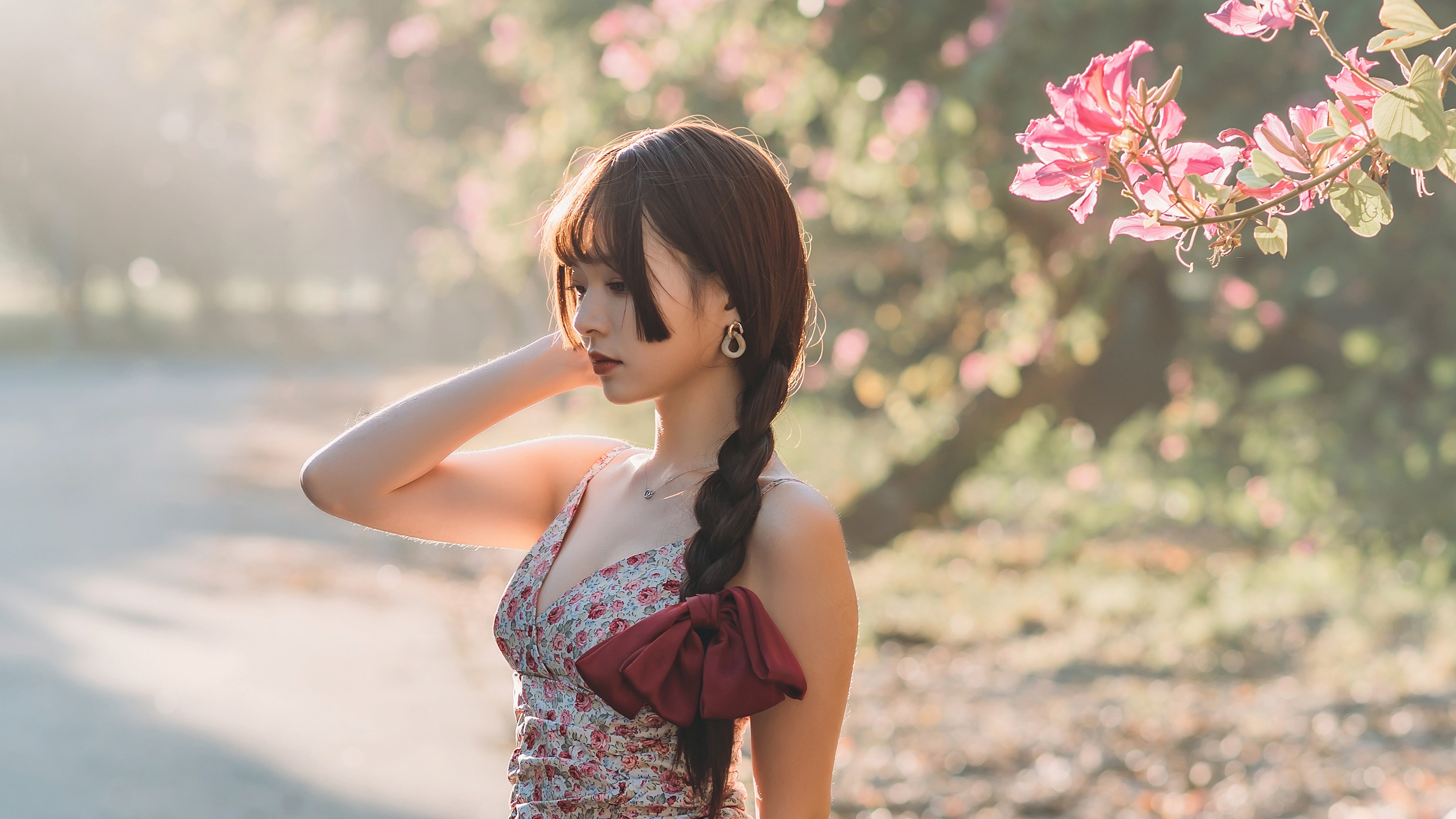 Description: A woman with a ponytail standing in front of a tree with pink flowers on it and a red purse.