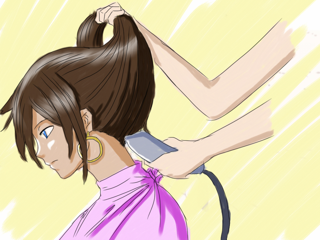 Description: A woman with a ponytail is holding her hair in the air and looking at the camera with a smile.