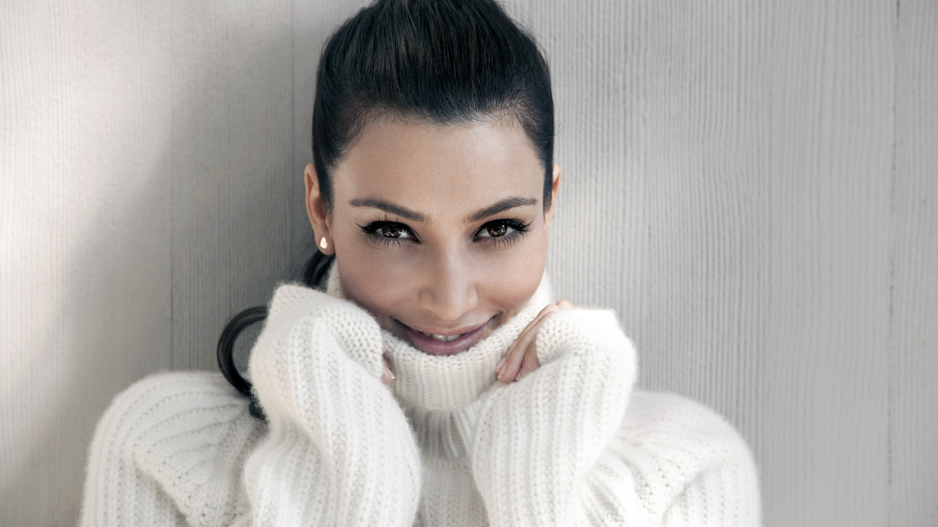 Description: A woman with a ponytail wearing a white sweater and smiling at the camera with her hands on her face.