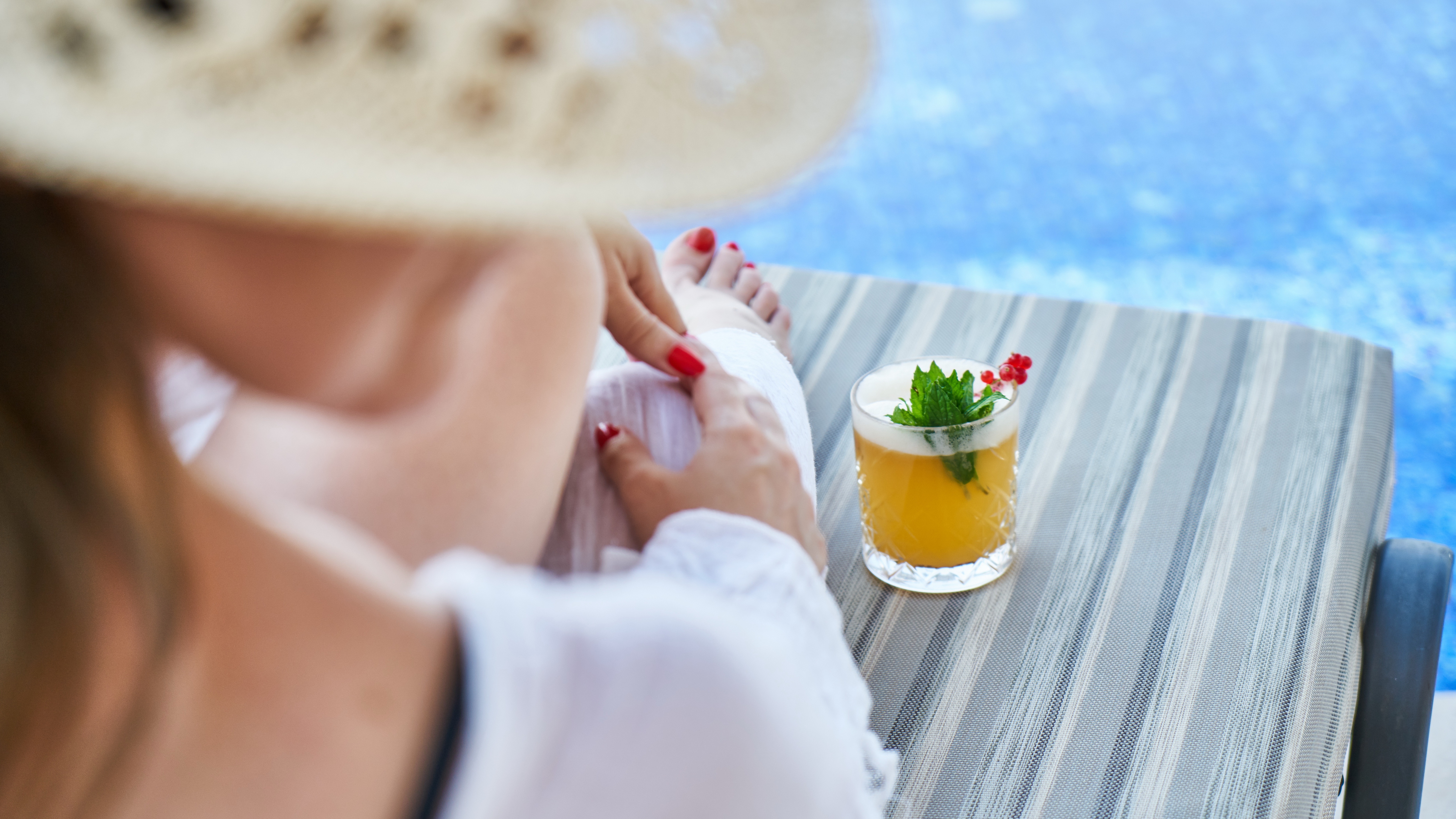 Description: A woman sitting at a table with a drink in front of her and a pool in the background with a blue sky.