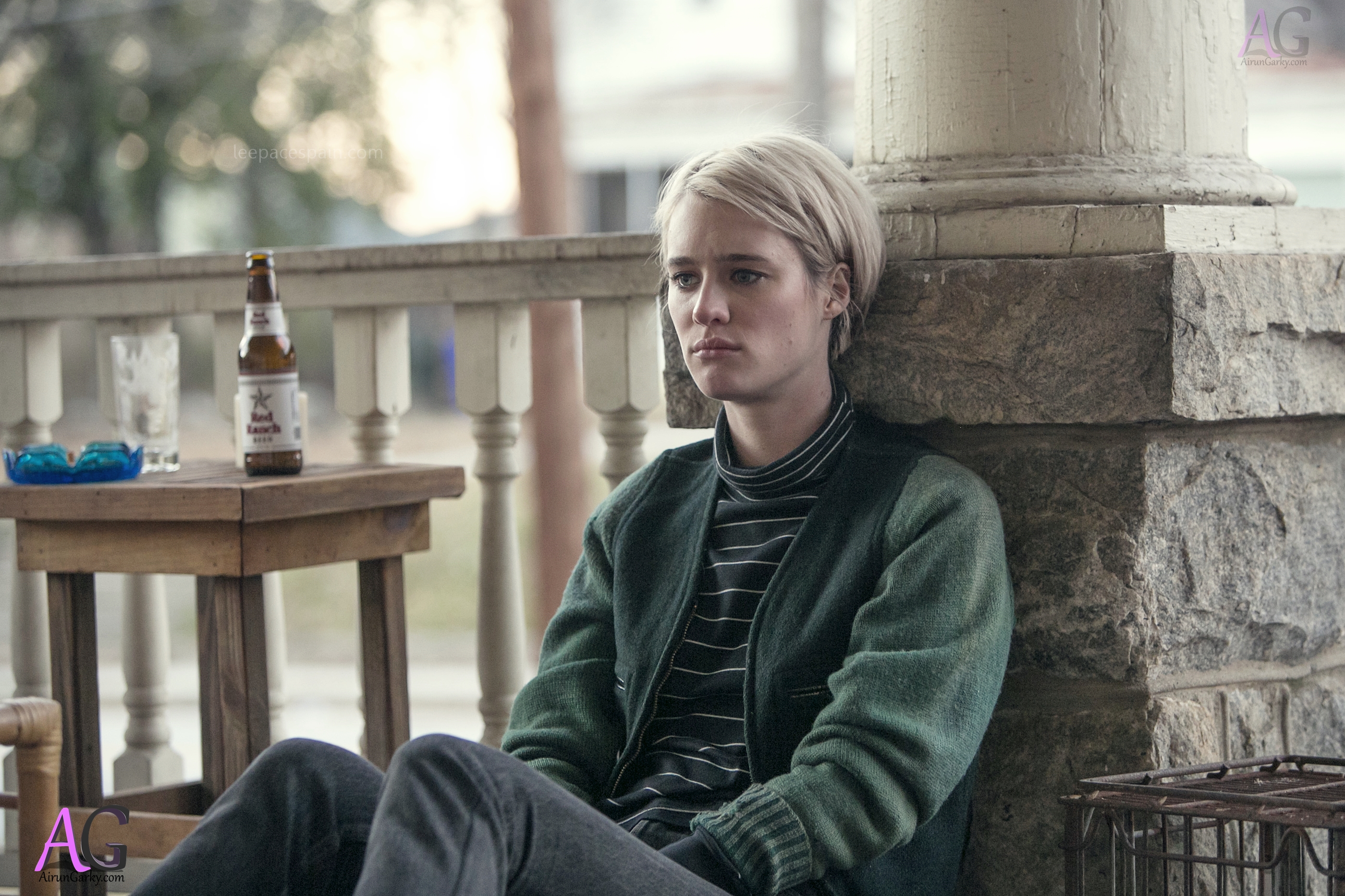 Description: A woman sitting on a porch next to a table with a bottle of beer on it and a birdcage.