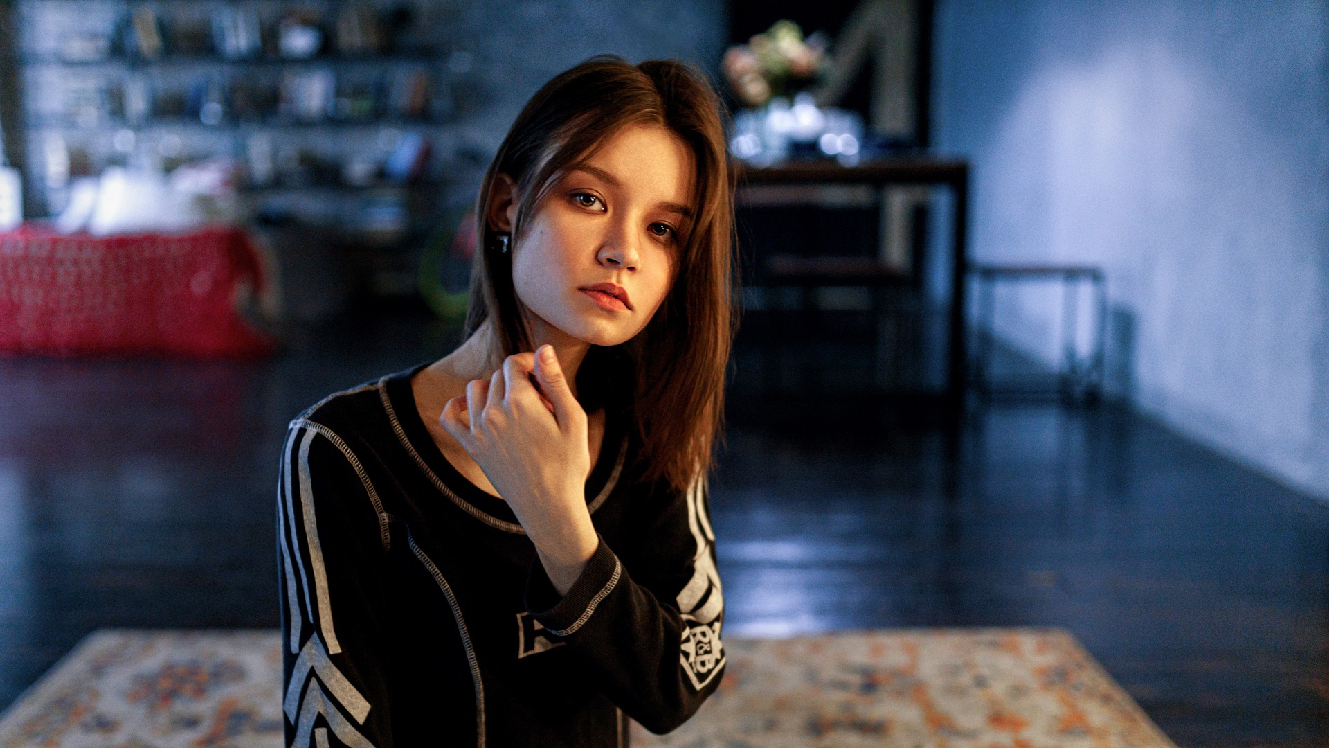 Description: A woman standing in a room with a rug on the floor and a rug on the floor behind her.