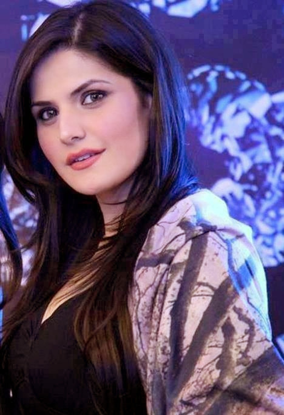 Description: A woman posing for a picture in front of a wall with a blue background and a black and white design.