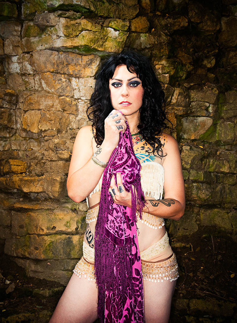Description: A woman in a purple costume holding a purple scarf over her face and posing for a picture in front of a stone wall.