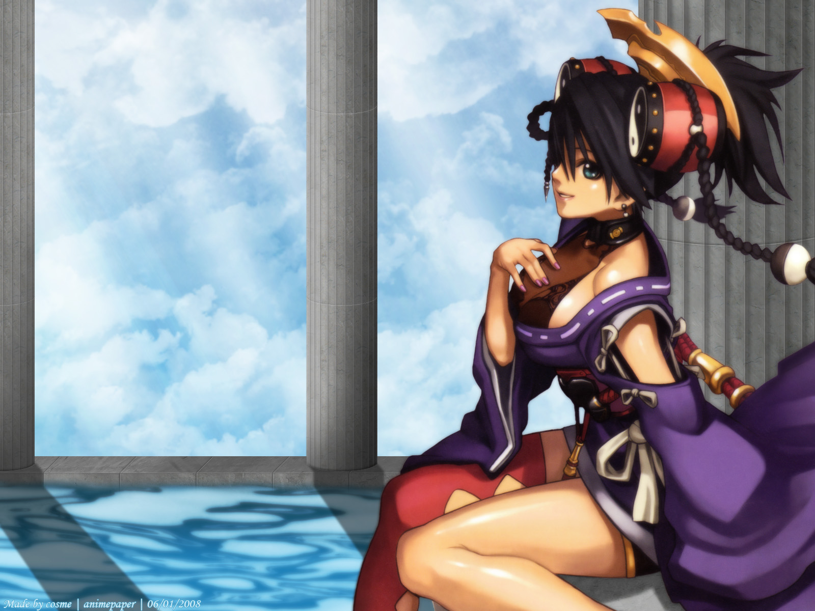 Description: A woman in a purple dress sitting on a chair next to a pillar and a window with columns in the background.