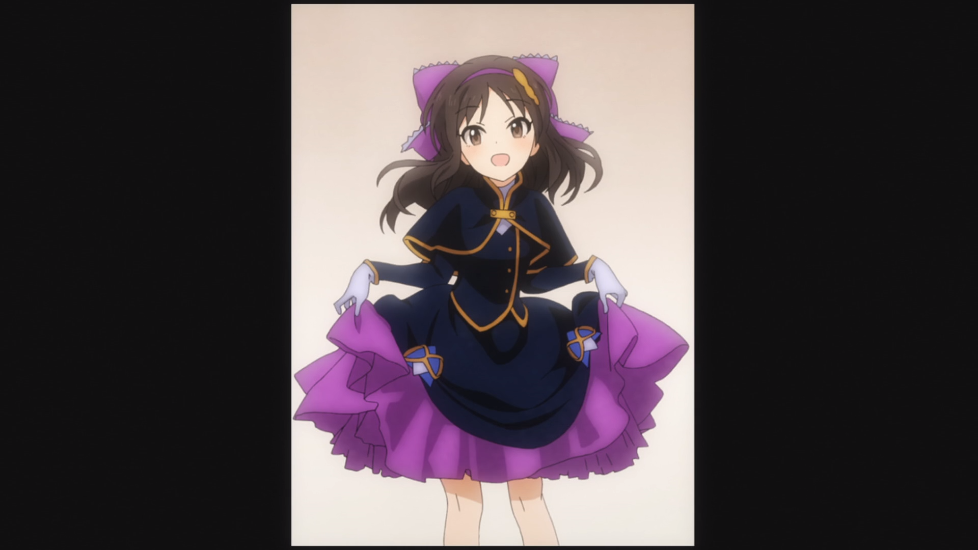 Description: A woman in a purple dress and hat standing in front of a wall with a black background and a white background.