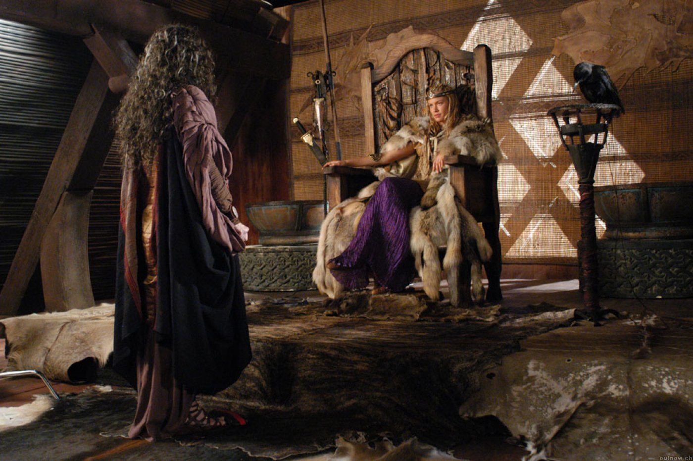 Description: A woman in a purple dress sitting on a chair next to a man in a purple dress and a sheep.