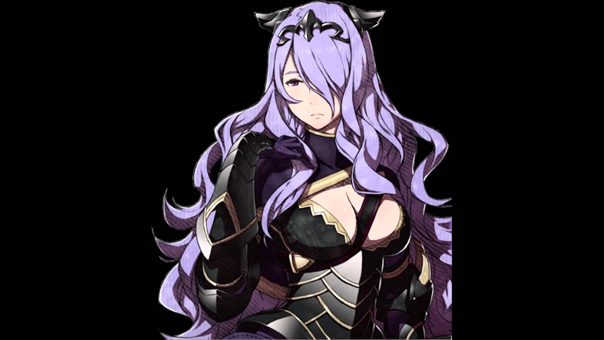 Description: A woman with long purple hair and horns on her head.