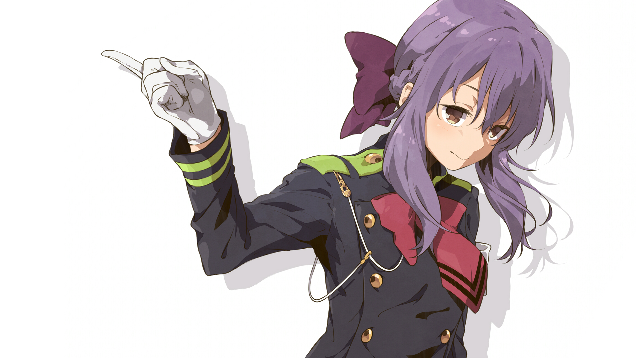 Description: A woman with purple hair and a purple hat is pointing at something with her hand and a green and red striped shirt.