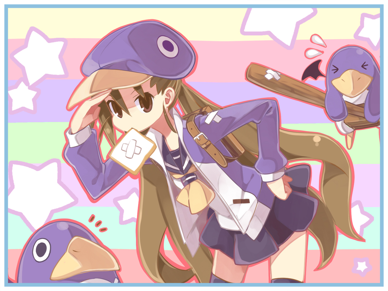 Description: A woman in a purple outfit and a bird on her shoulder and a baseball bat in her hand and a bird on her shoulder.