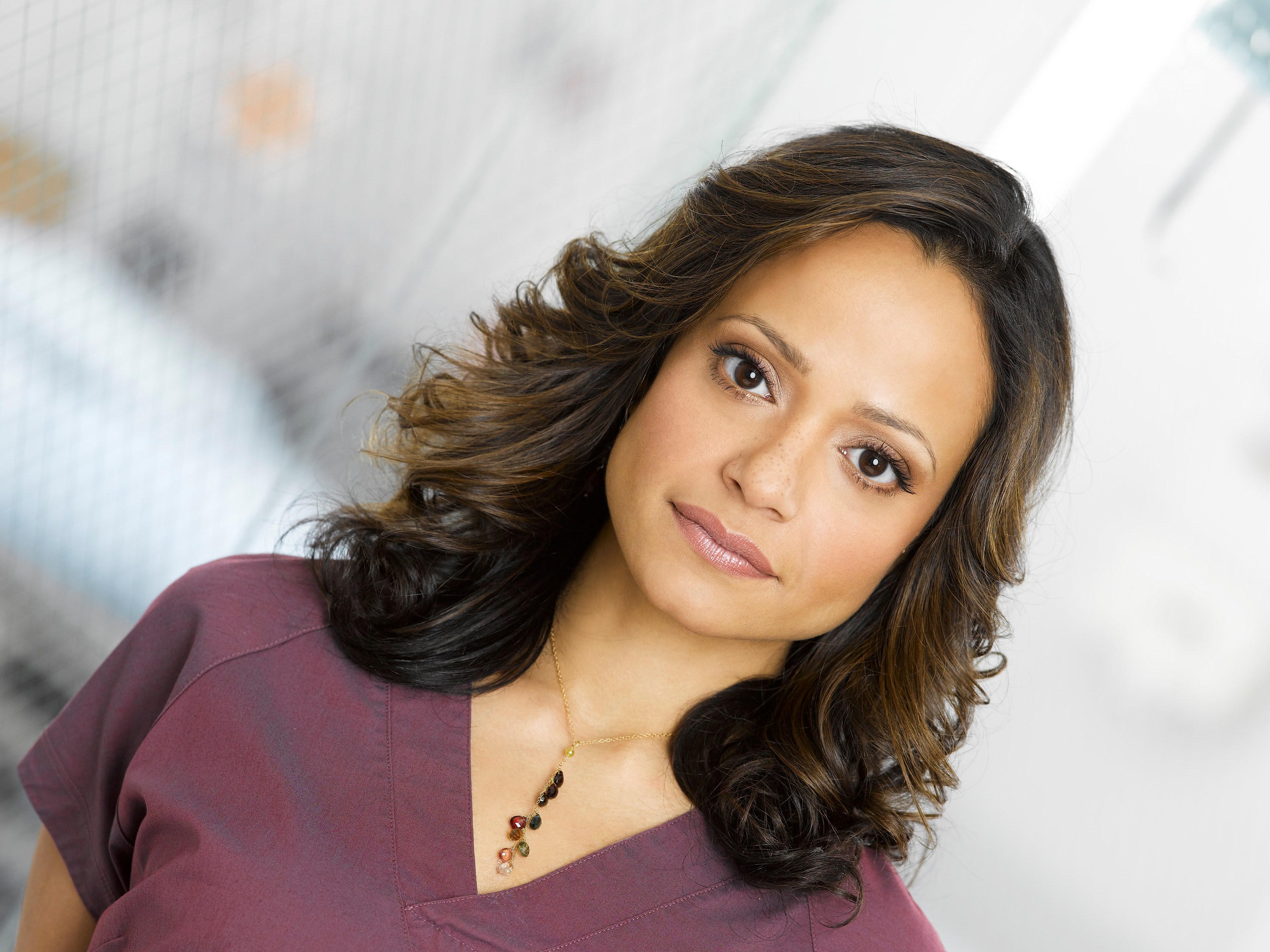 Description: A woman in a purple shirt is posing for a picture with a white background and a white wall behind her.