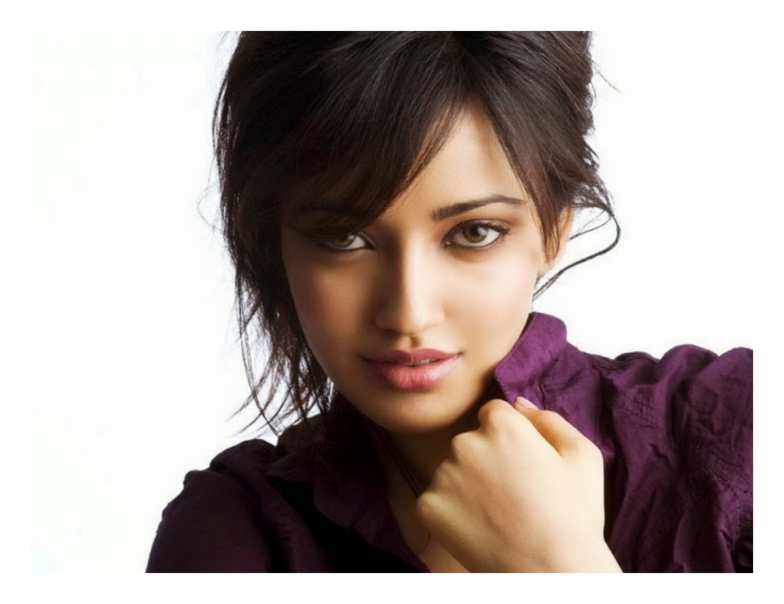 Description: A woman with a purple shirt and a watch on her wrist and a white background with a white background.