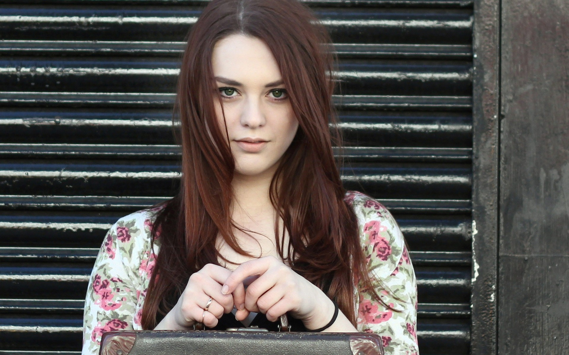 Description: A woman holding a purse in front of a metal door with shutters behind her and a black background.