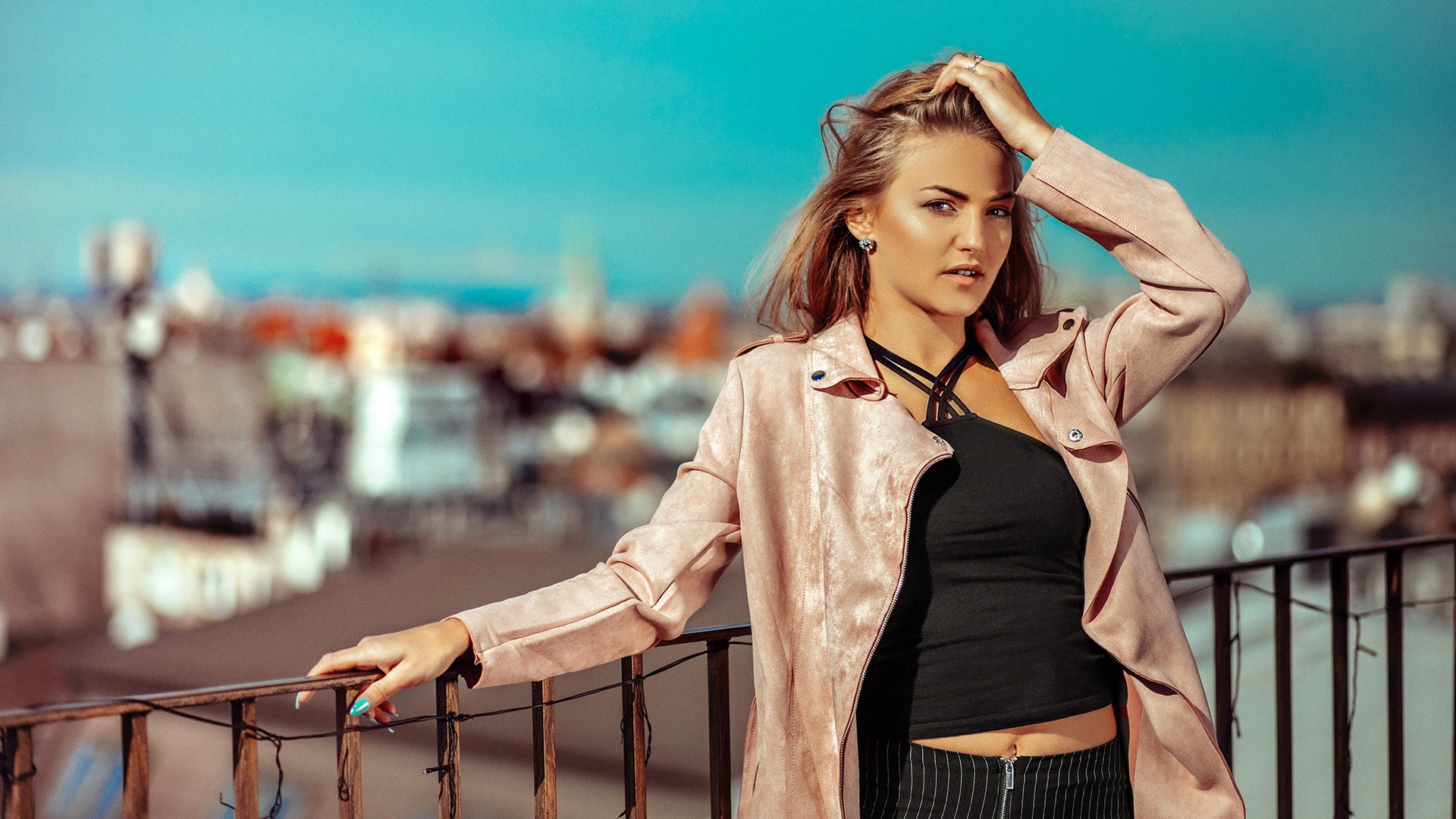 Description: A woman leaning on a railing with her hands on her head and a city in the background with a blue sky.