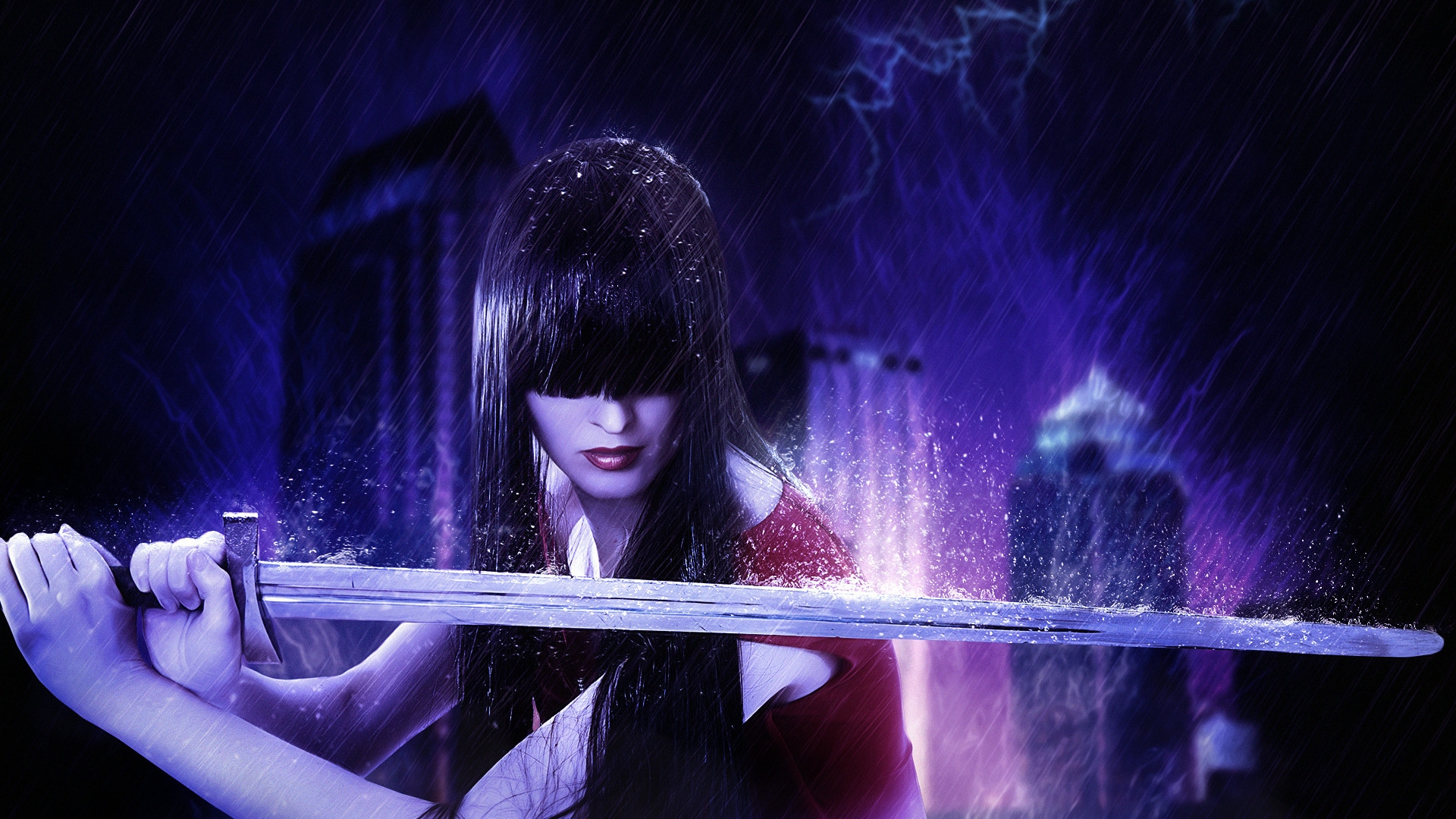 Description: A woman holding a sword in the rain with a city in the background at night time with purple lighting.