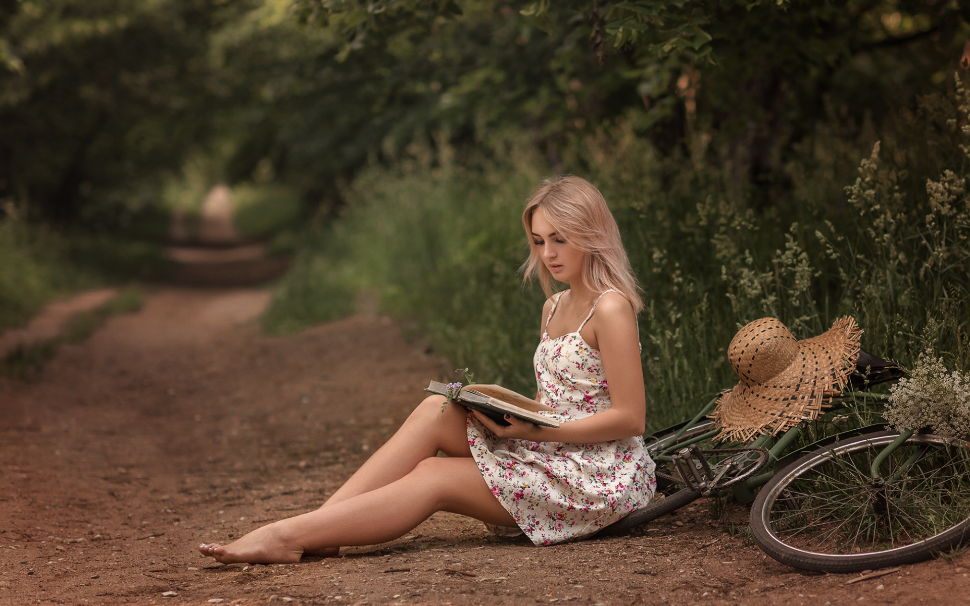 Description: A woman sitting on the ground reading a book next to a bike and a basket of flowers and grass.