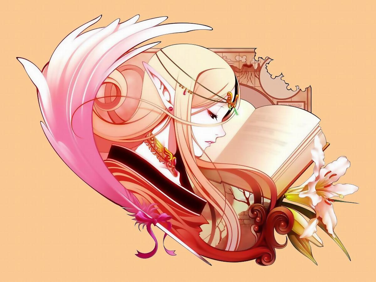 Description: A woman with long hair and a book in her hands is sitting down and reading a book with a flower in her hand.