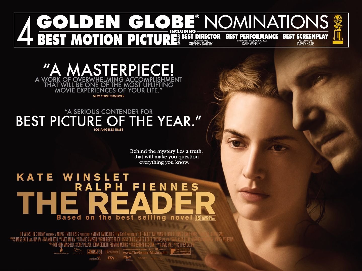Description: A movie poster with a woman reading a book and a man looking at a book in front of her.