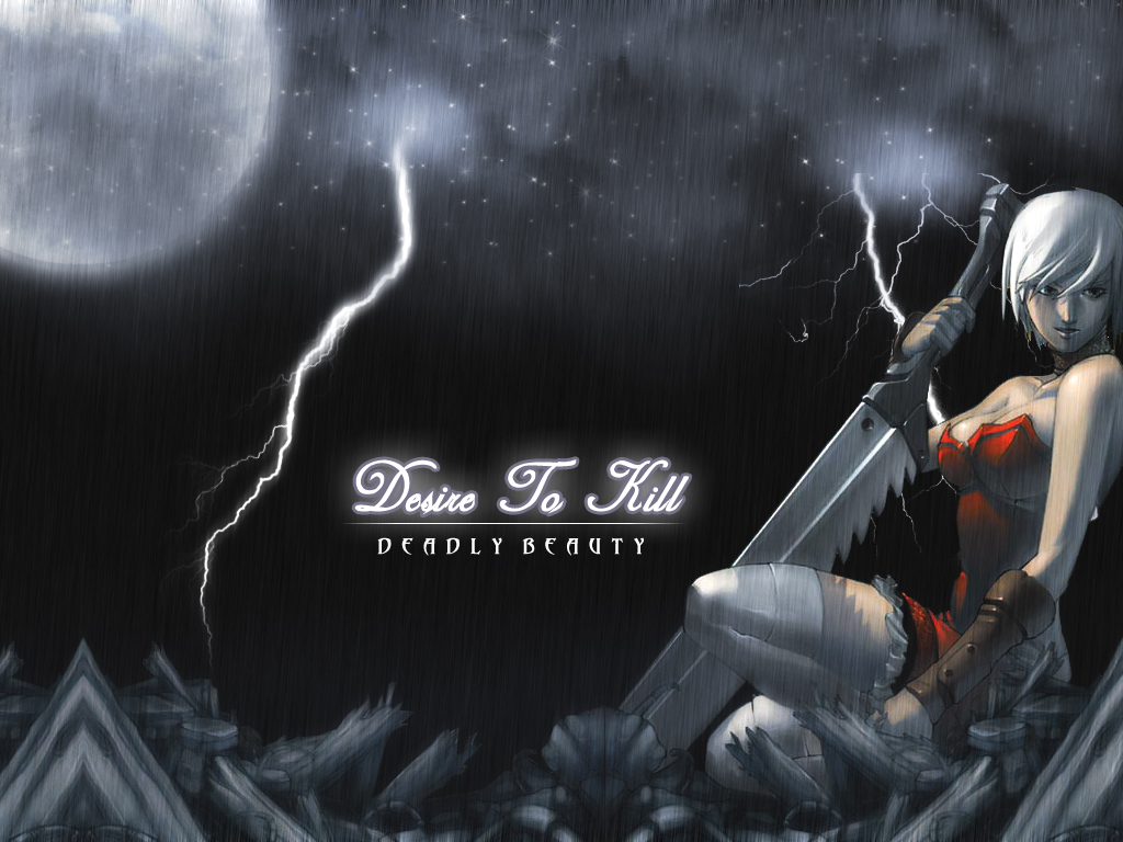 Description: A woman in a red bikini holding a sword in the rain with a full moon behind her and a lightning bolt.
