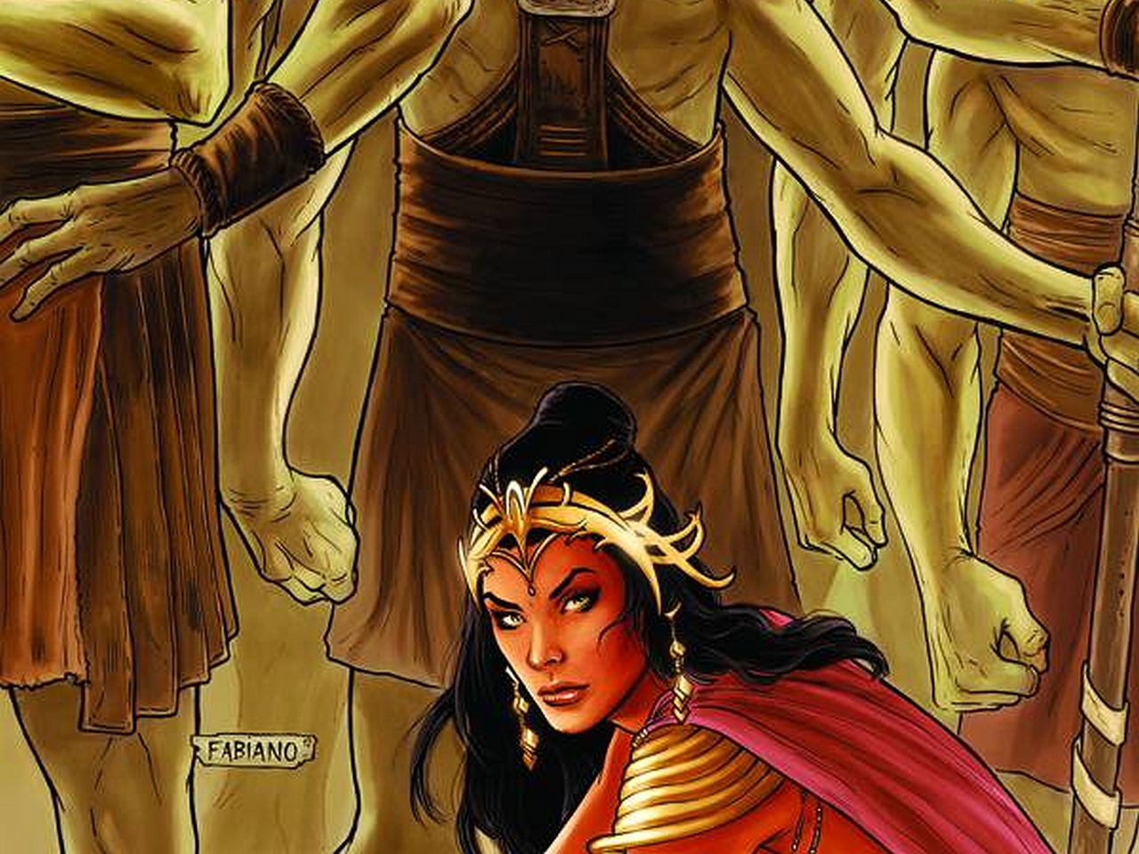 Description: A woman in a red cape and a man in a yellow shirt and a red cape and a sword.
