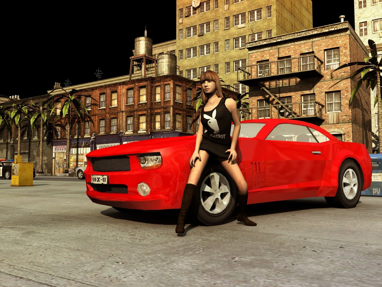 Description: A woman standing next to a red car in a city at night time with palm trees and buildings in the background.