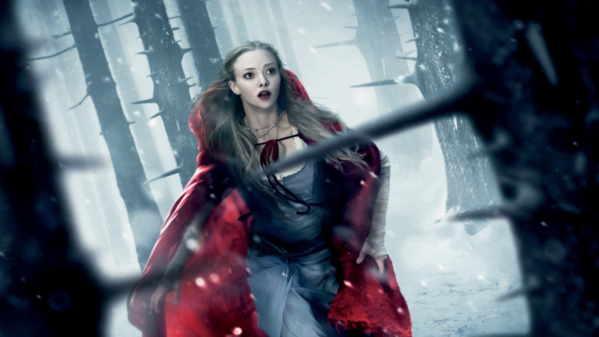 Description: A woman in a red cloak and a red cape is walking through a forest in the snow with a knife in her hand.