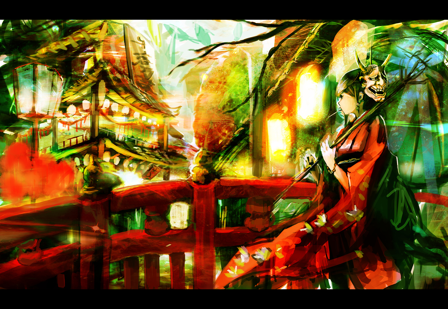 Description: A woman in a red coat is standing near a fence and a red fence with a green tree in the background.