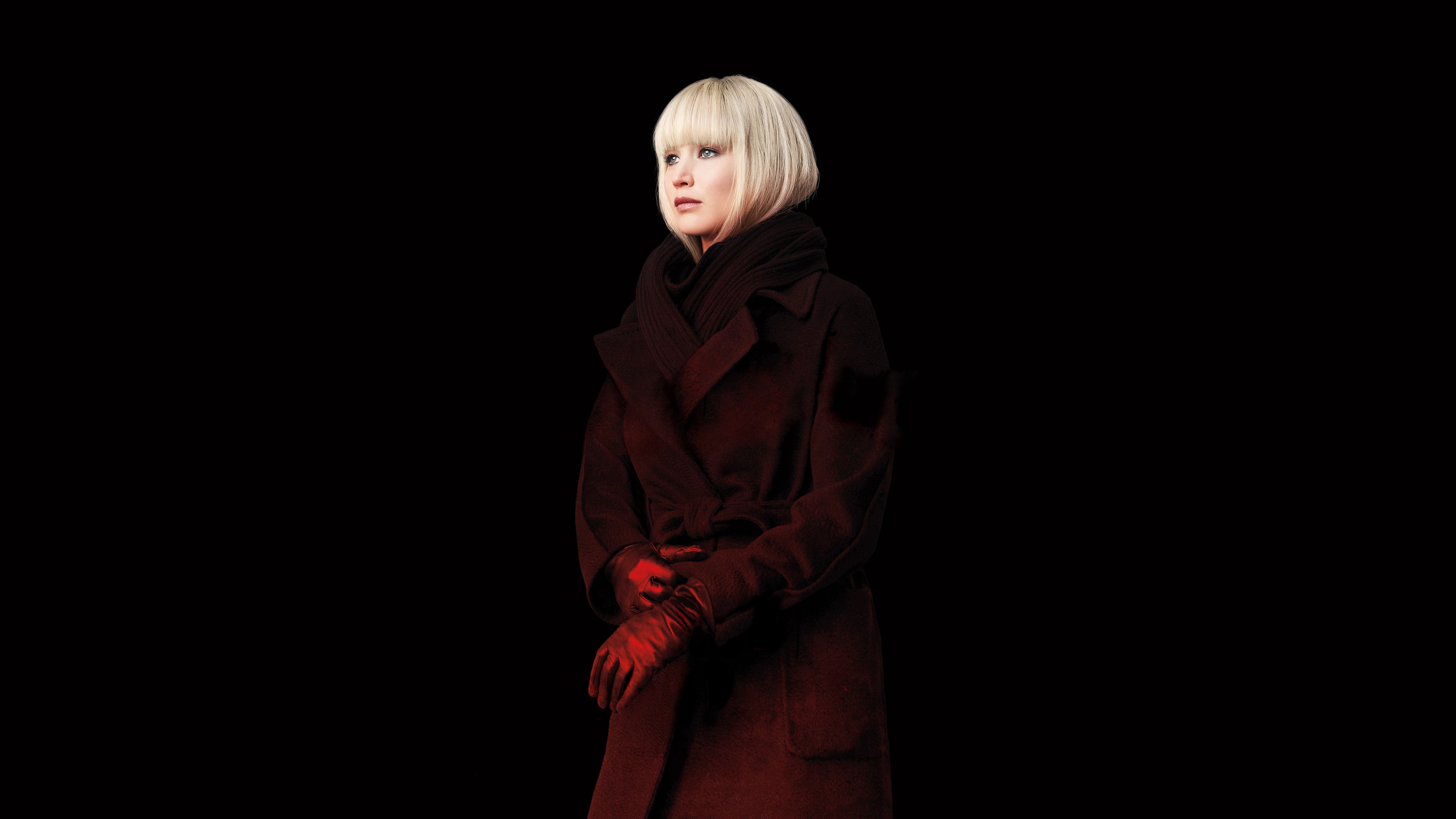 Description: A woman in a red coat and red gloves standing in the dark with her hands on her hips and her hands on her hips.