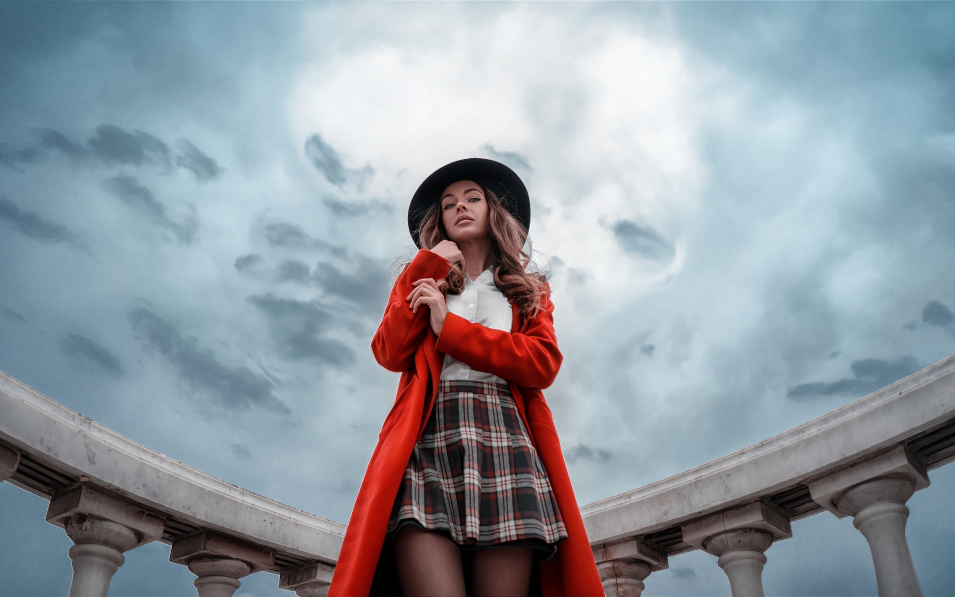 Description: A woman in a red coat and plaid dress is standing on a bridge with a cloudy sky behind her.