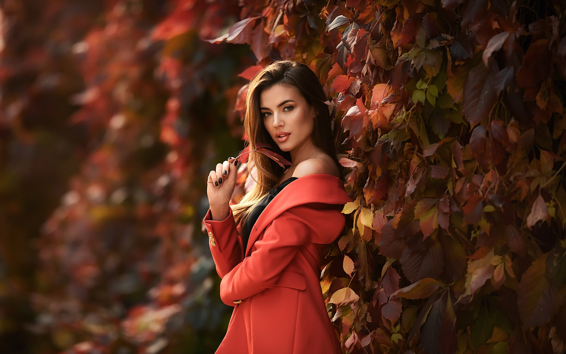 Description: A woman in a red dress is leaning against a wall with leaves on it and posing for a picture.