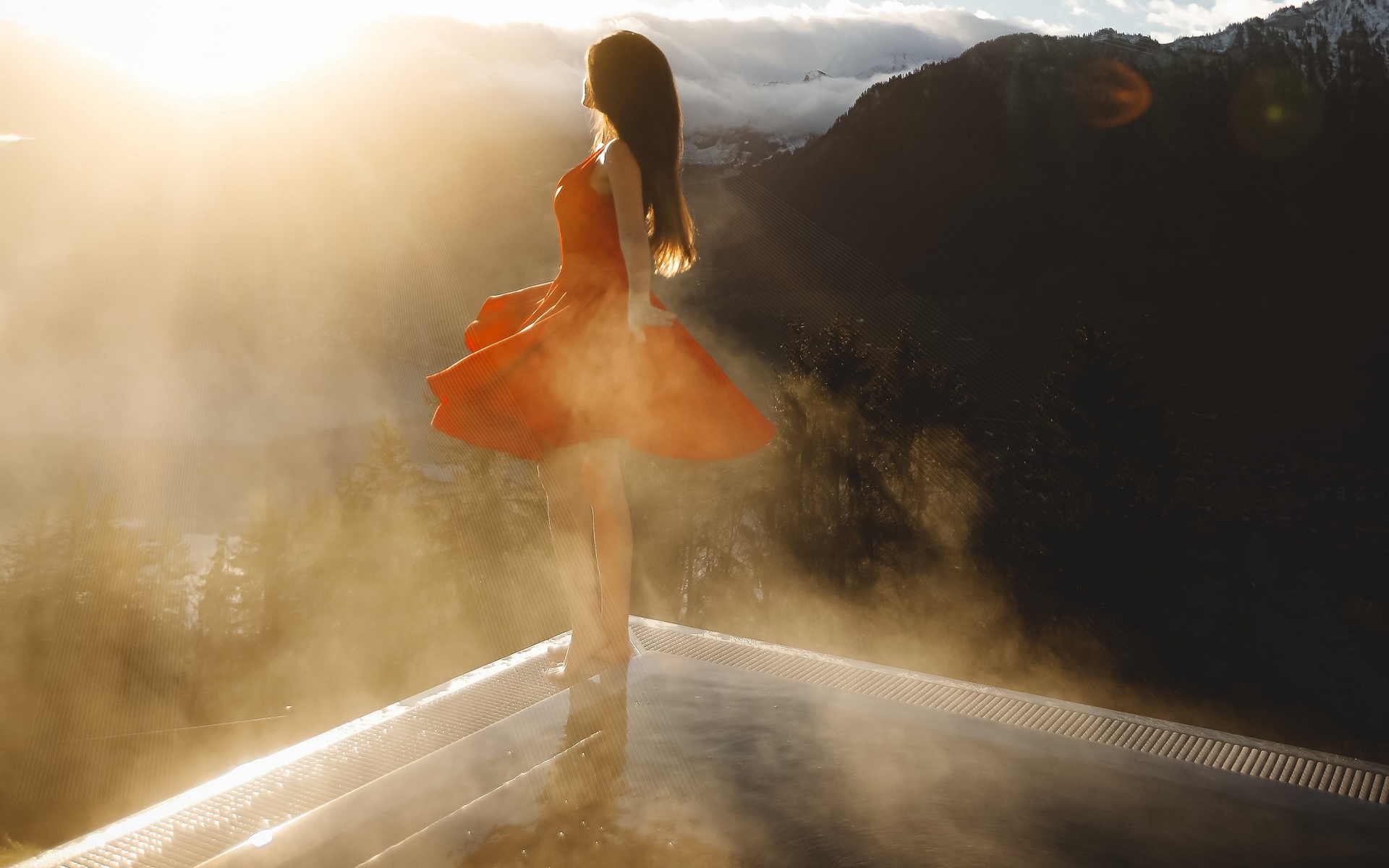 Description: A woman in a red dress standing on a balcony with a view of mountains and clouds in the background.