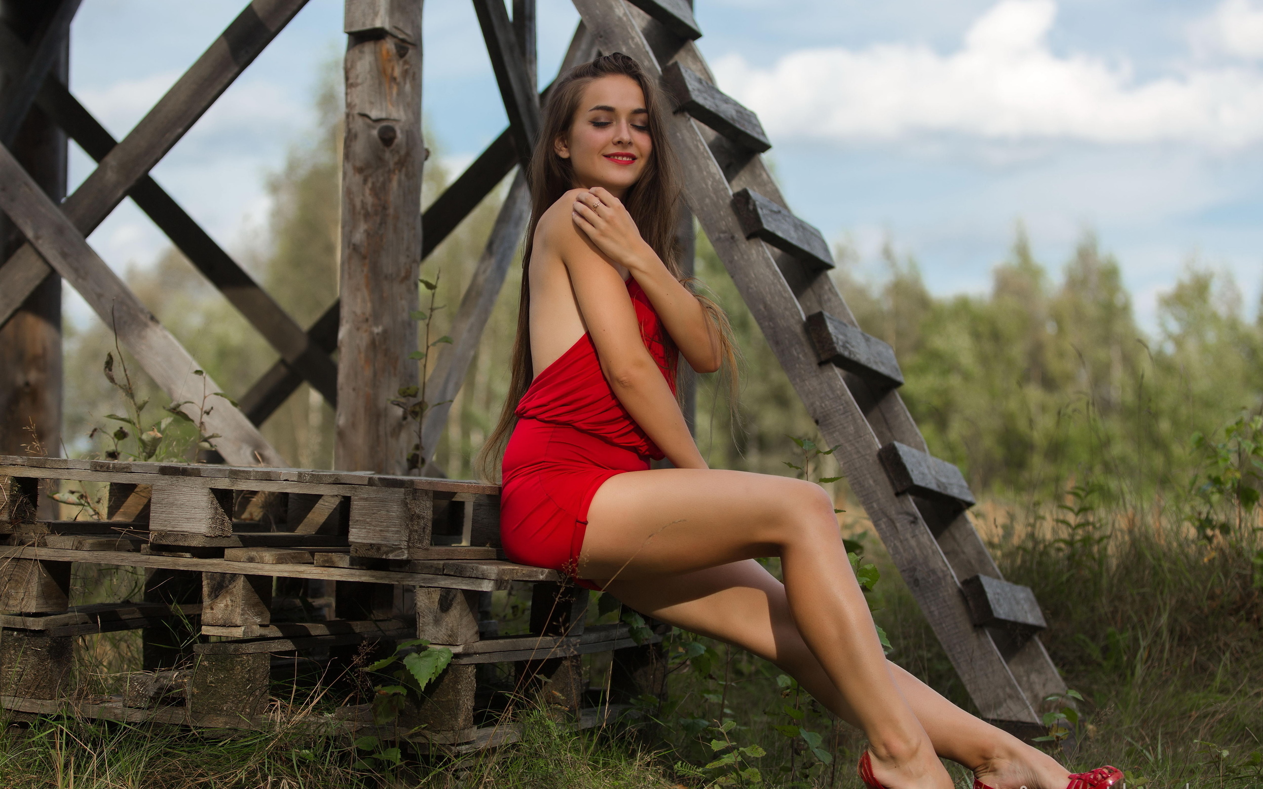 Description: A woman in a red dress sitting on a wooden bench in a field of grass and trees.