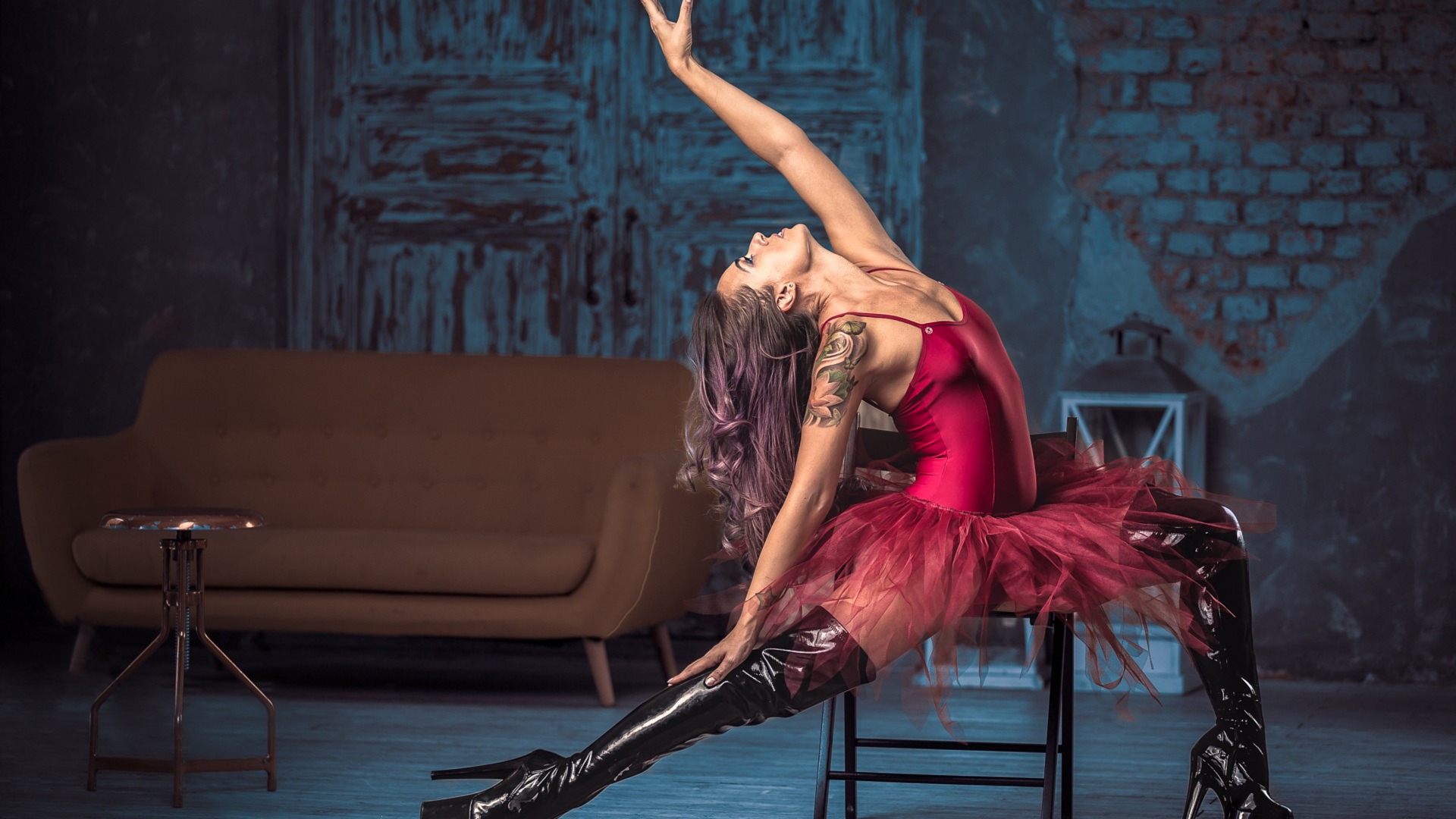 Description: A woman in a red dress and black boots is posing on a chair with her legs up and her leg up.