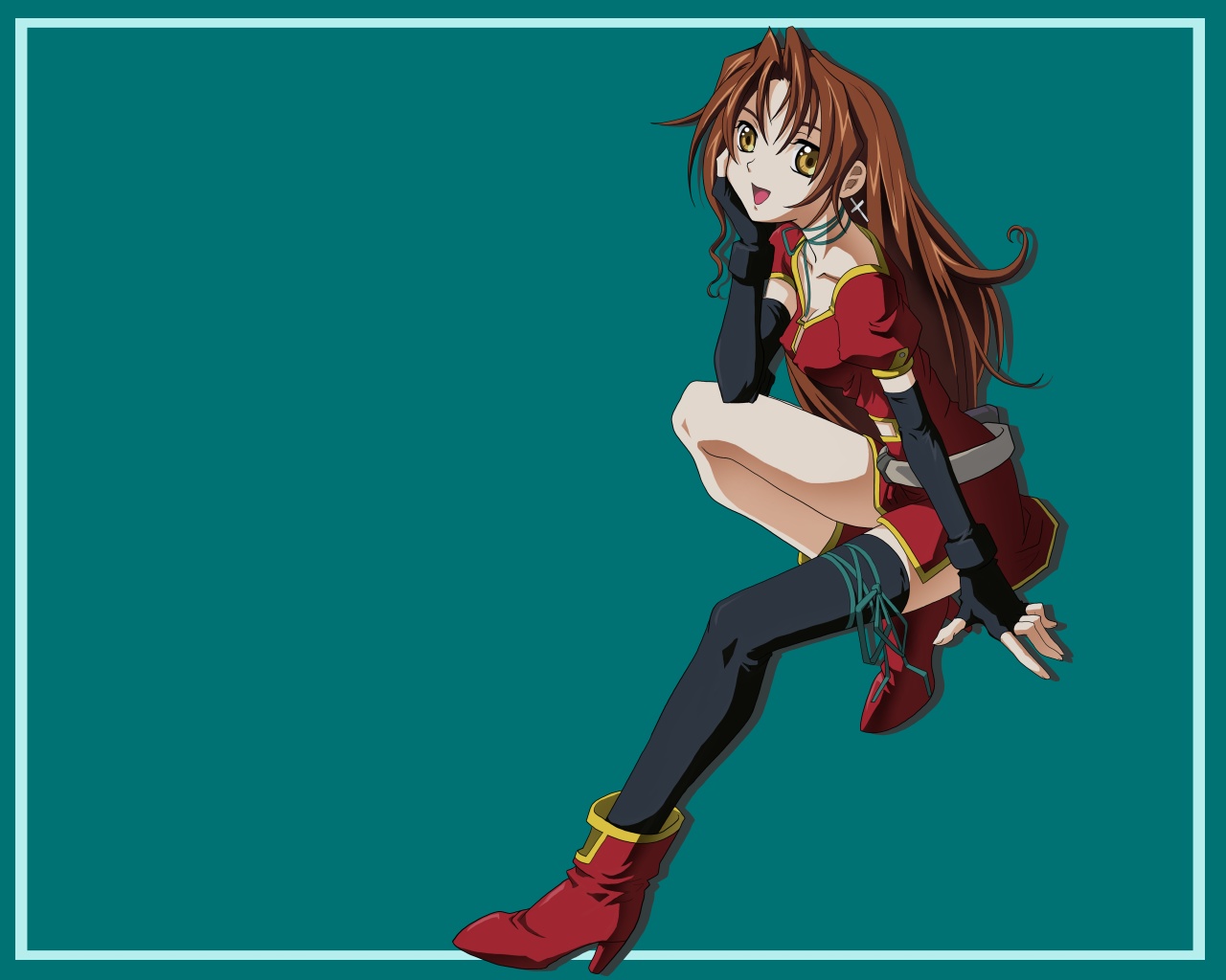 Description: A woman in a red dress and boots is sitting on a blue background with a square frame around her.