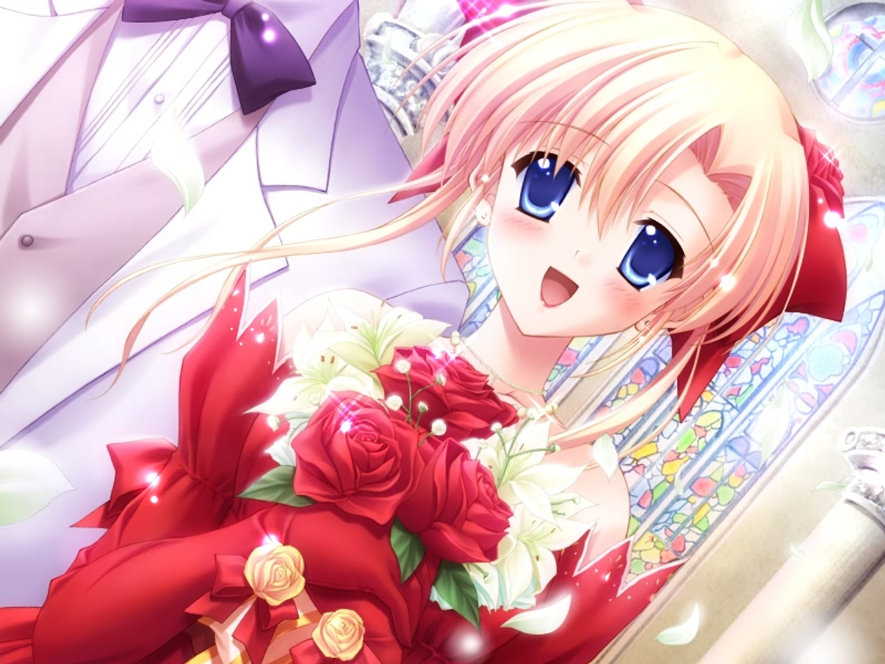 Description: A woman in a red dress holding a bouquet of flowers next to a man in a suit and tie.