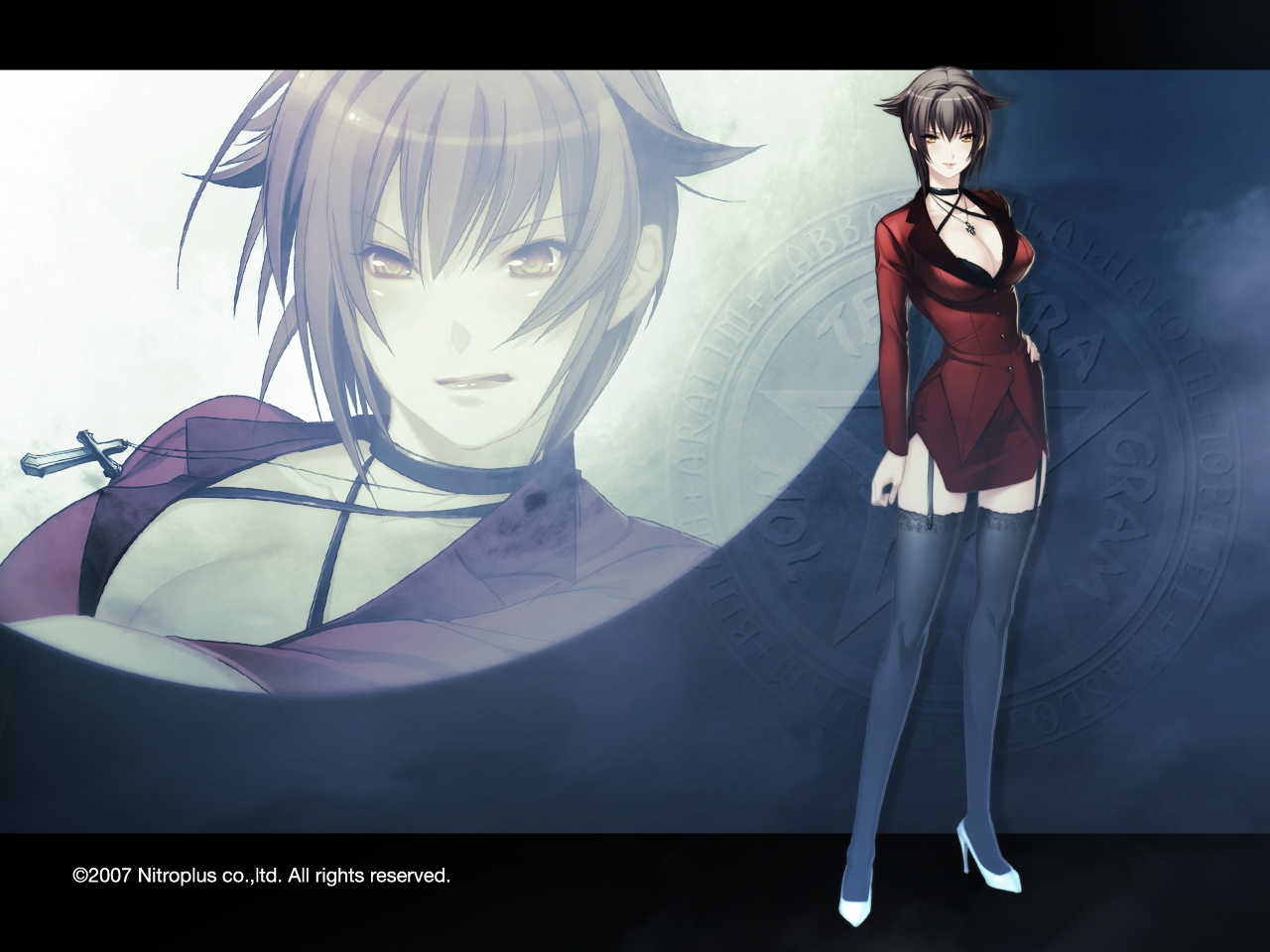Description: A woman in a red dress standing next to a clock and a demon with horns on her head and a sword in her hand.