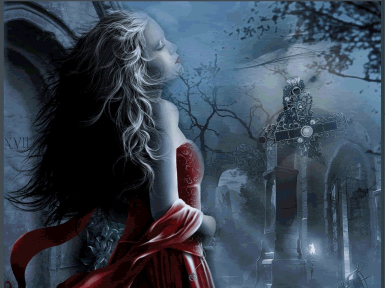 Description: A woman in a red dress standing in front of a clock tower with a red ribbon around her neck.