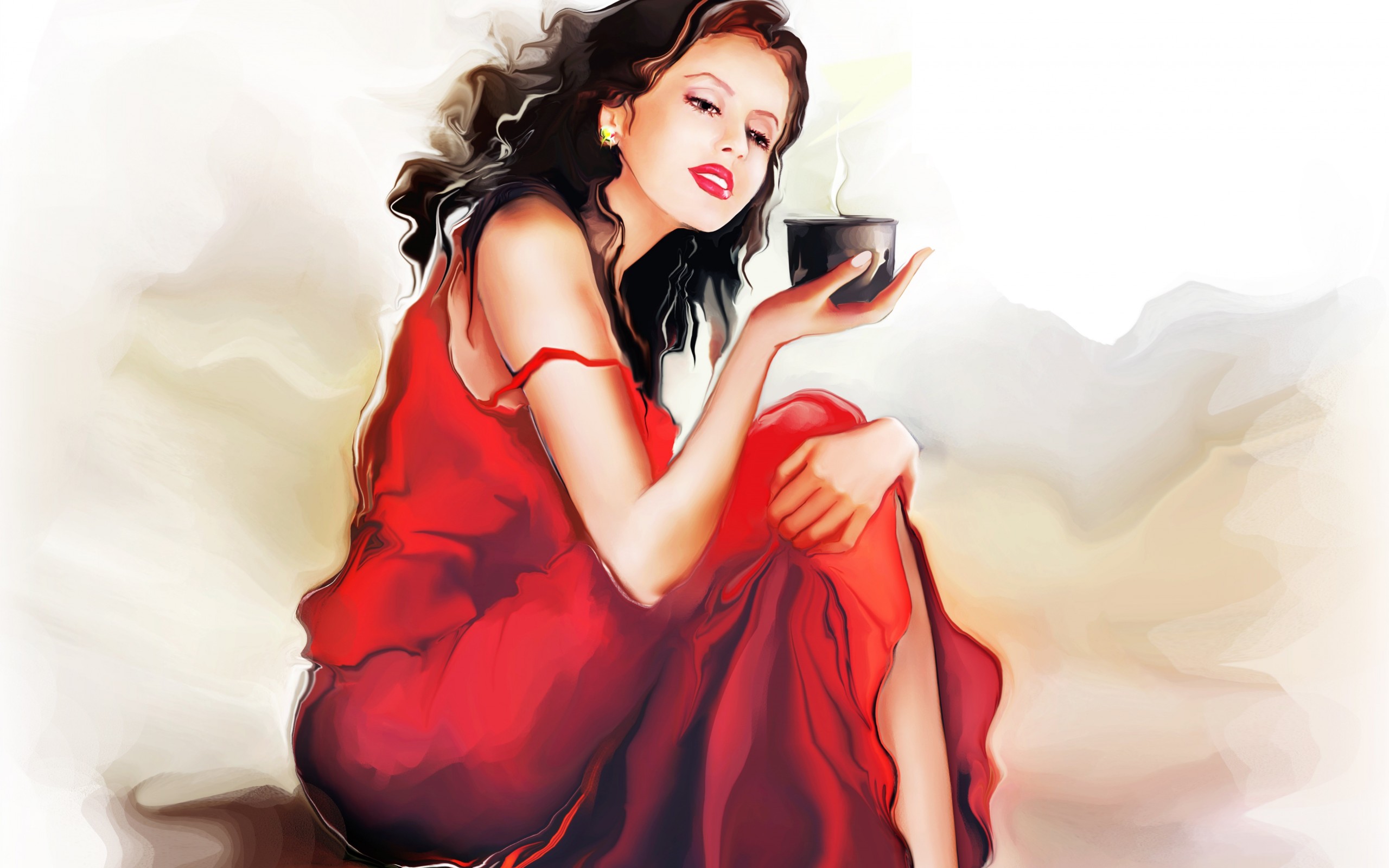 Description: A woman in a red dress holding a cup of coffee and looking at her phone while sitting on a chair.